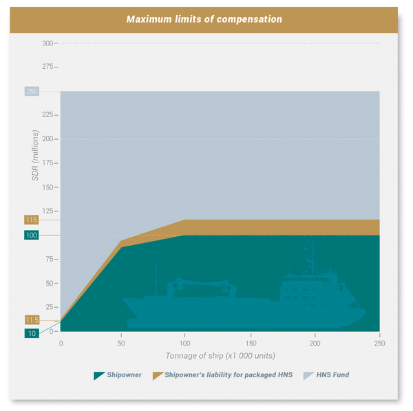 Where damage is caused by HNS in bulk, the shipowner will normally be able to limit his financial liability to an amount between 10 million and 100 million Special Drawing Rights (SDR) of the International Monetary Fund (approximately USD15 million to USD150 million), depending on the gross tonnage of the ship. Where damage is caused by packaged HNS, the maximum liability for the shipowner is 115 million SDR (approximately USD175 million). The HNS Fund will provide an additional tier of compensation up to a maximum of 250 million SDR (approximately USD380 million), including any amount paid by the shipowner and his insurer.